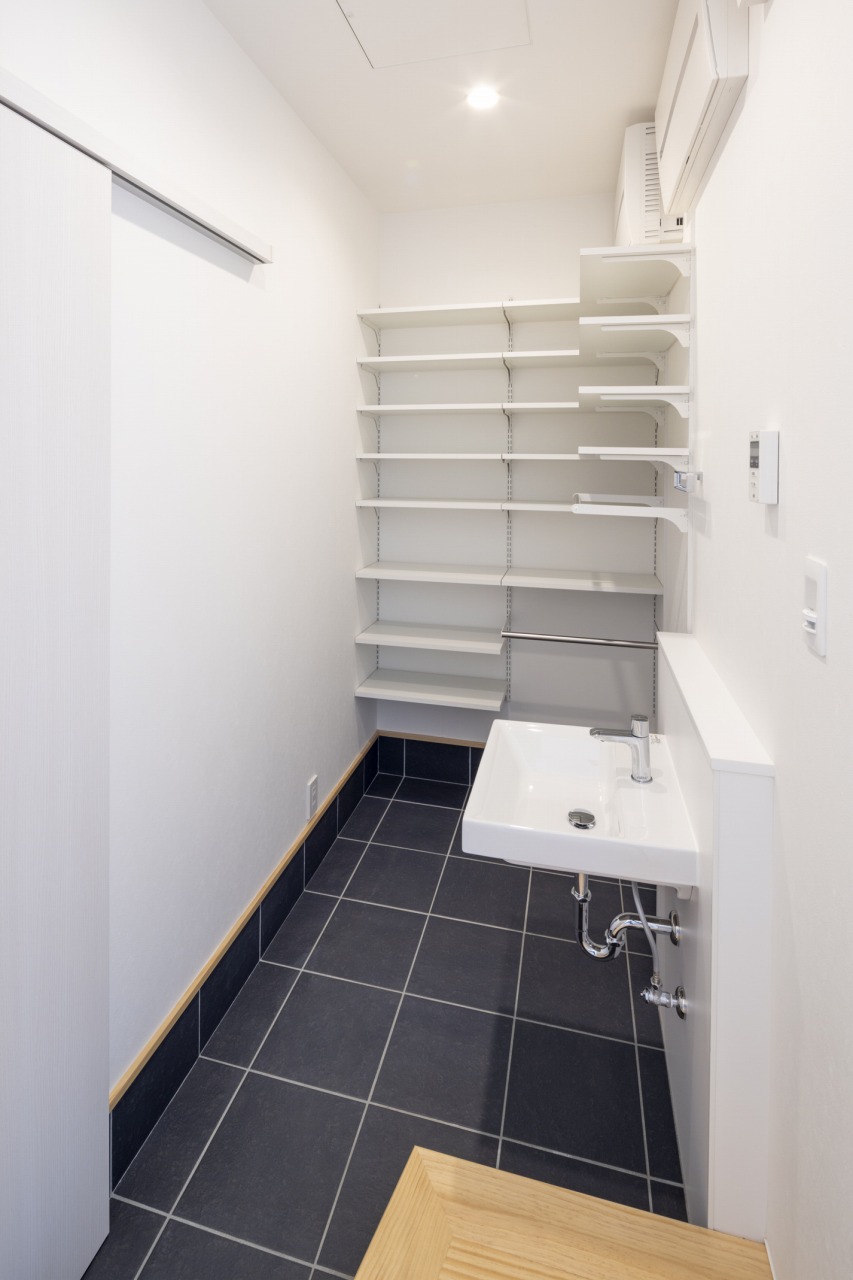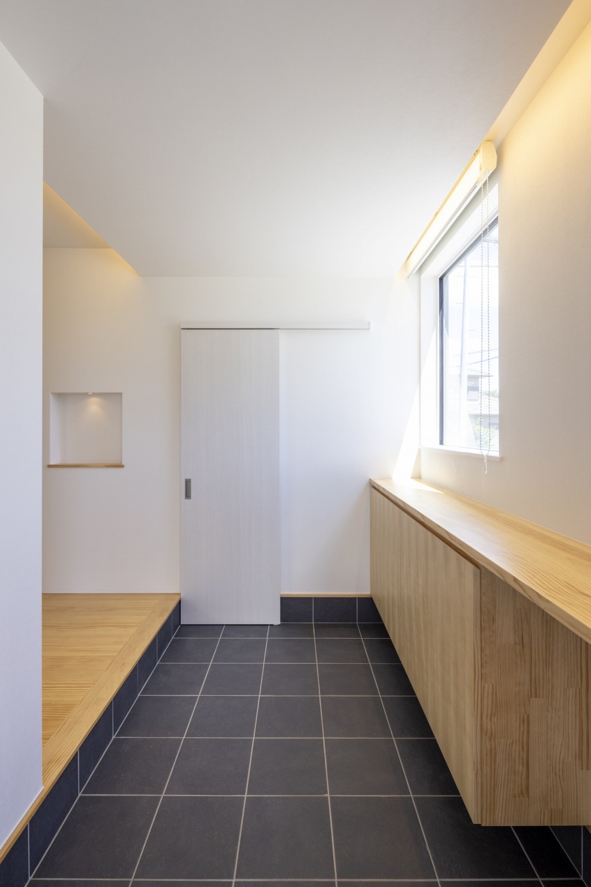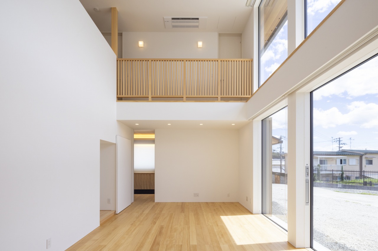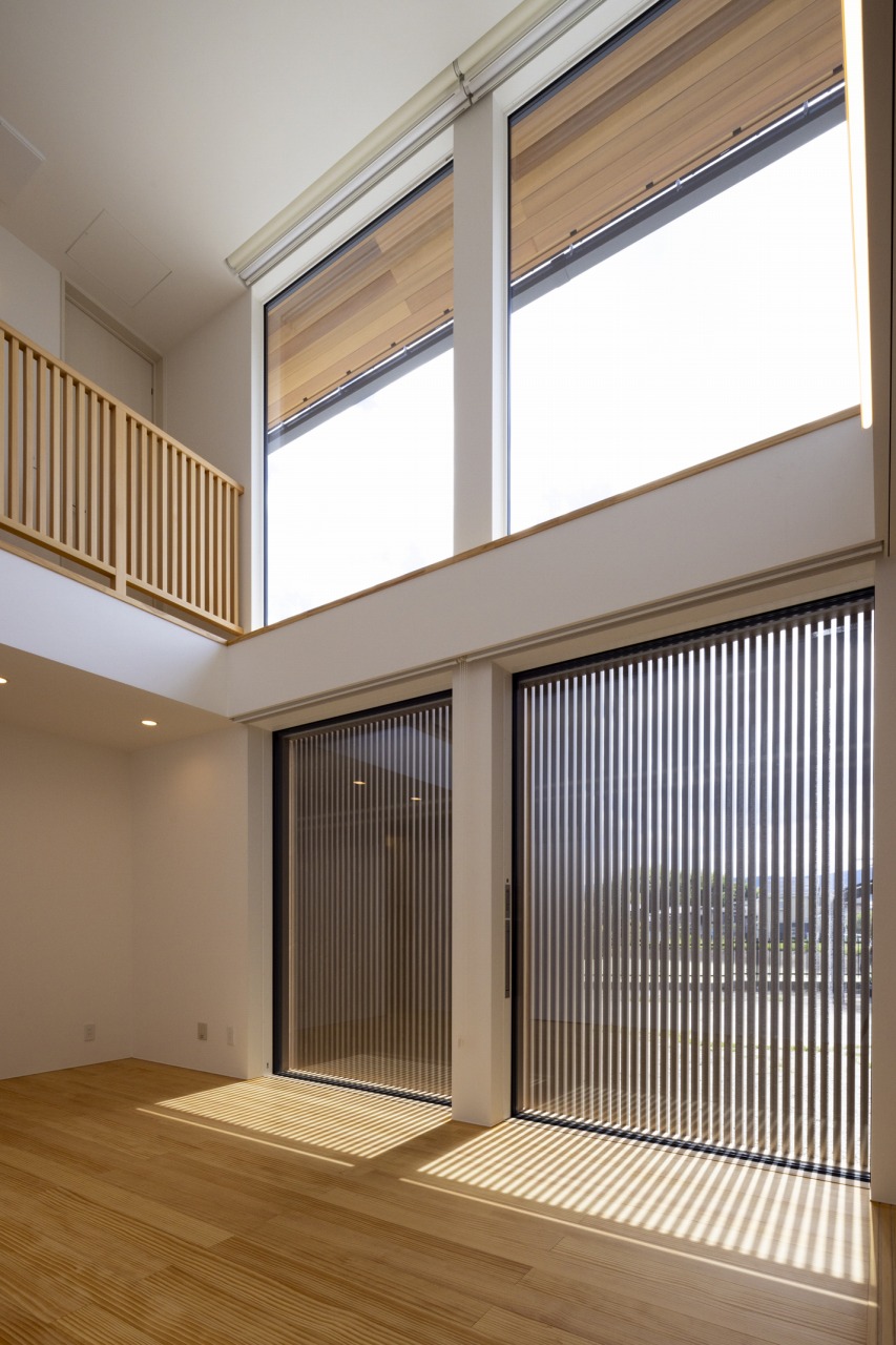大きな窓から差し込む光と、縦格子がつくる美しい陰影がリビングを彩ります。