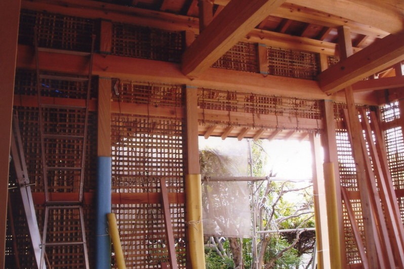 竹を割り出し、編みこんで下地を作り、土を塗って壁を作る。